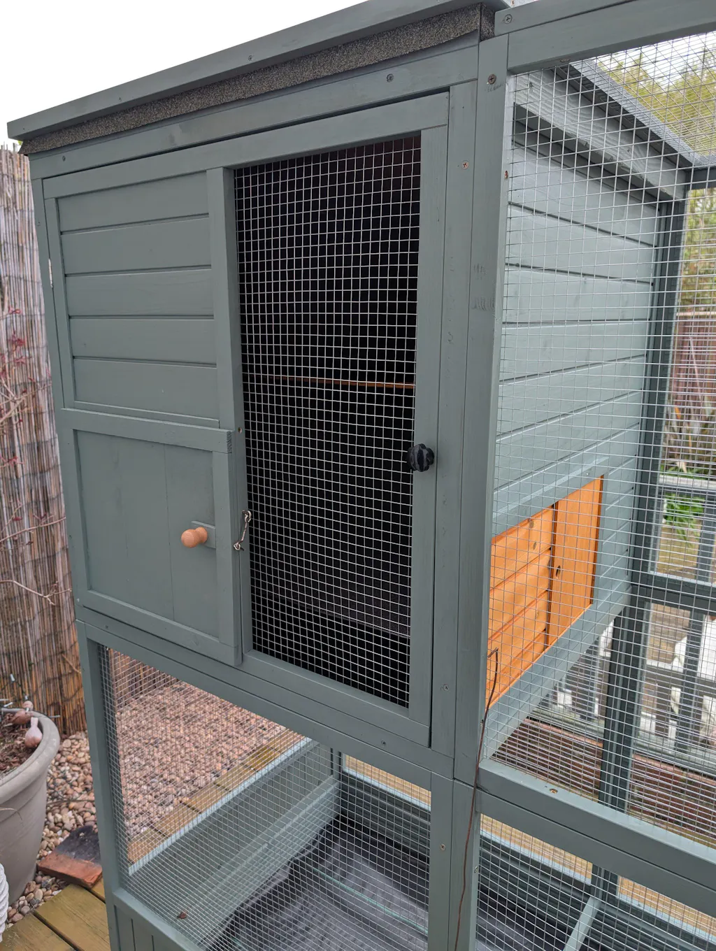 Based on pictures I already knew it would need adapting. Moved the 2 doors to the end of the flight run, joined the doors together to make one large door, reinforced the 2 joining panels. I would never have got down low enough to get inside. Fixed another piece of mesh part way down on the inside so all I have to do is duck my head to get in. As there is no safety porch I fitted an aluminium chain door curtain as a security measure - it works and the birds don't like the noise and fly down the other end - care is still needed but much better. My garden is quite windy so I didn't trust a roof that opened - screwed this shut - didn't make any sense to me to have an opening roof on an aviary. The roof is not made of solid wood (a frame covered with thin ply) - I added another layer of roofing felt to give more substance and hopefully more weather resistance.